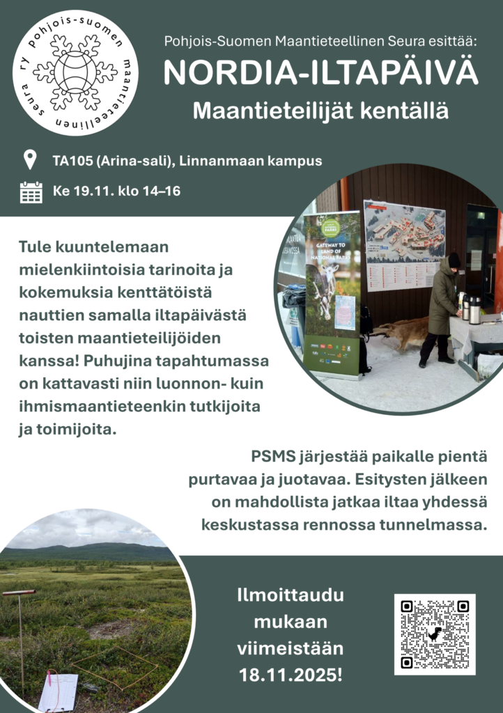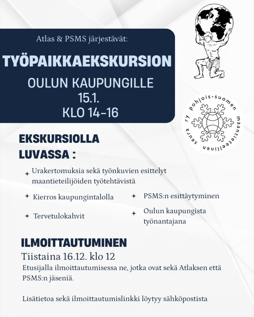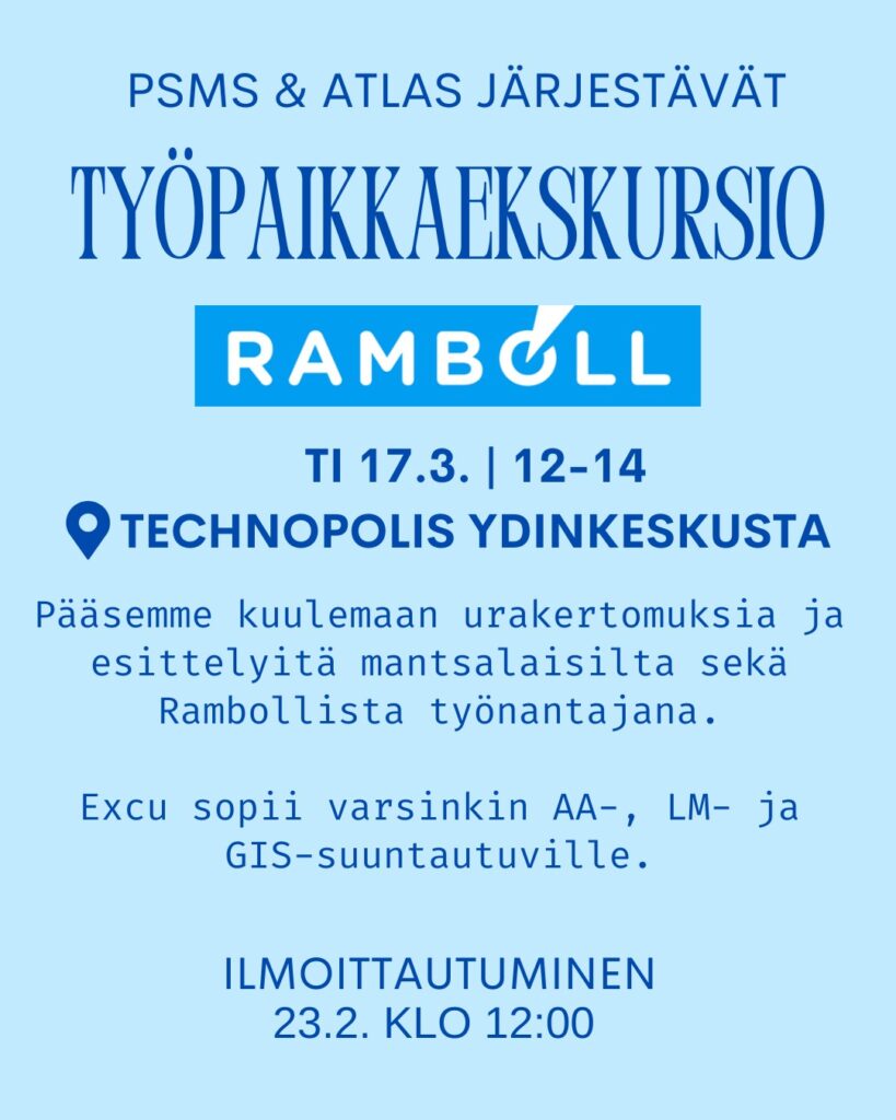 PSMS ja Atlas järjestävät opiskelijoille suunnatun työpaikkaekskursion Rambollille tiistaina 17.3. klo 12-14. Exculla pääsemme kuulemaan urakertomuksia ja esittelyitä monipuolisista työtehtävistä maantieteeltä valmistuneilta, sekä saamme tietoa Rambollista työnantajana. Excu sopii varsinkin AA-, LM- ja GIS-suuntautuville. Tapahtuma alkaa kahvitarjoilulla.